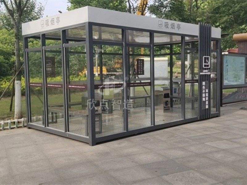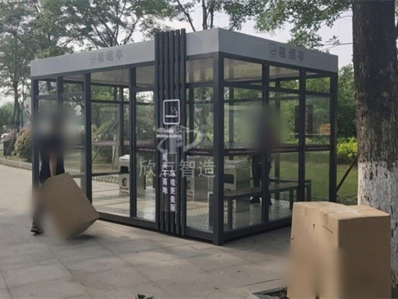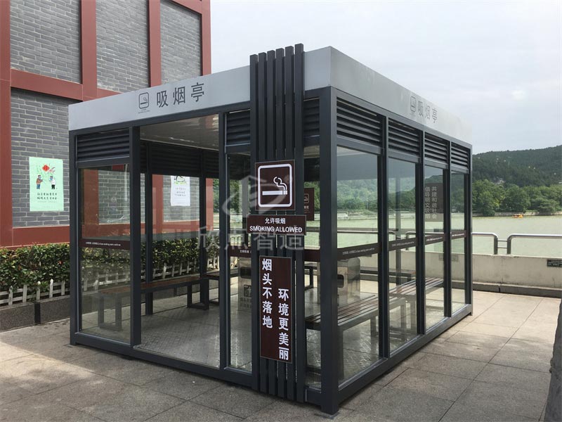 鋼化玻璃吸煙亭:光線明亮,安裝方便,工廠組裝好成品整體運輸?shù)跹b到位,堅固耐用,使用壽命至少十年,重型鋼結(jié)構(gòu),抗臺風。頂部使用鋁板防水隔熱材料,保證下雨不漏水,隔音效果優(yōu)良。并且內(nèi)置電路,只要通電就可以在亭內(nèi)使用電力設施,室內(nèi)配置休息椅和煙灰桶,方便的功能,時尚的外觀,實在是廣大禁煙場所的不二之選!